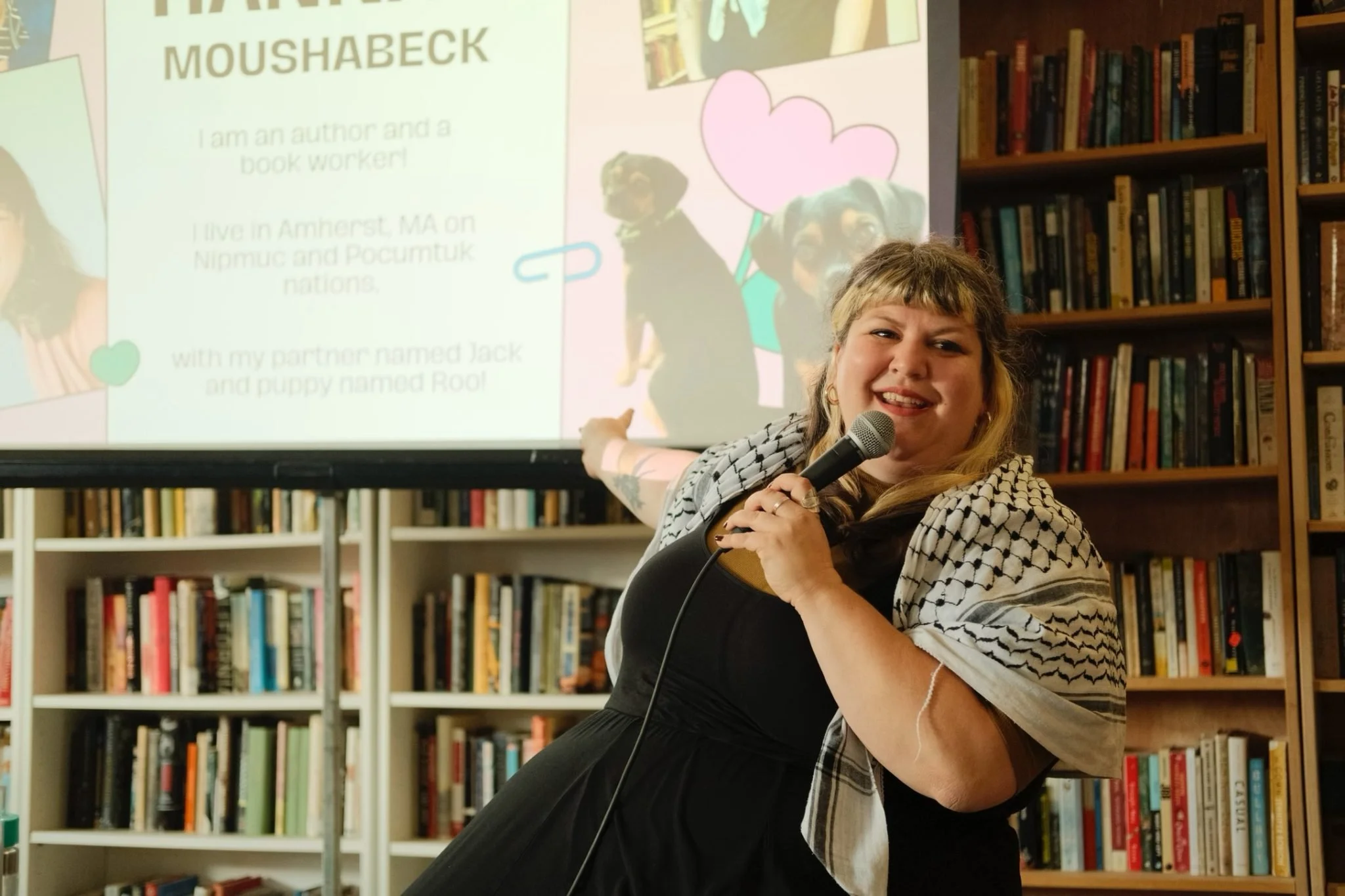 Hannah Moushabeck is a second-generation Palestinian American author and book worker who was raised in a family of publishers and booksellers and learned the power of literature at a young age. Hannah has worked in publishing for over a decade at companies such as Chronicle Books, The Quarto Group, and Simon & Schuster. She now runs Interlink Publishing, the only Palestinian-owned publisher in the United States, alongside her family. Her debut picture book Homeland: My Father Dreams of Palestine (Chronicle Books) won The New England Book Award and The Arab American Book Award. She lives in Amherst, Massachusetts on the homelands of the Pocumtuc and Nipmuc Nations.